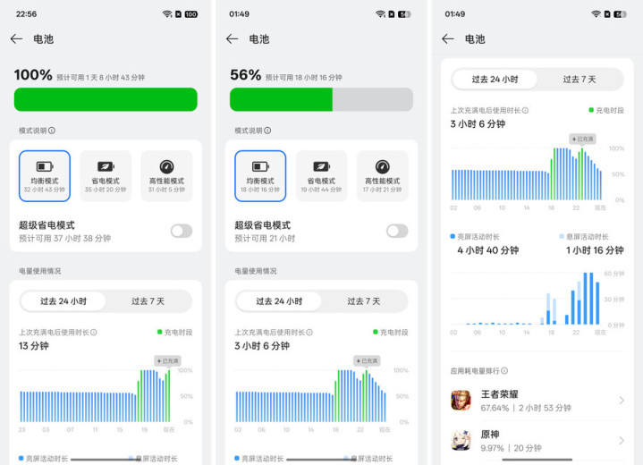 续航方面,OPPO K15 Pro配备7500mAh冰川电板,搭配80W超等闪充,透顶处置用户的续航狂躁。7500mAh超大容量电板,咱们实测数据夸耀,《王者荣耀》144fps极致帧率快要3小时,以及20分钟60fps帧率《原神》游戏后的重度使用,已经还有56%电量,出差、旅行基本上无需佩戴充电宝。