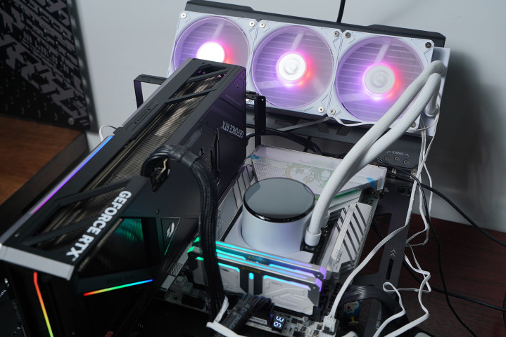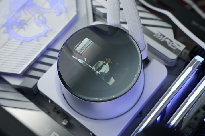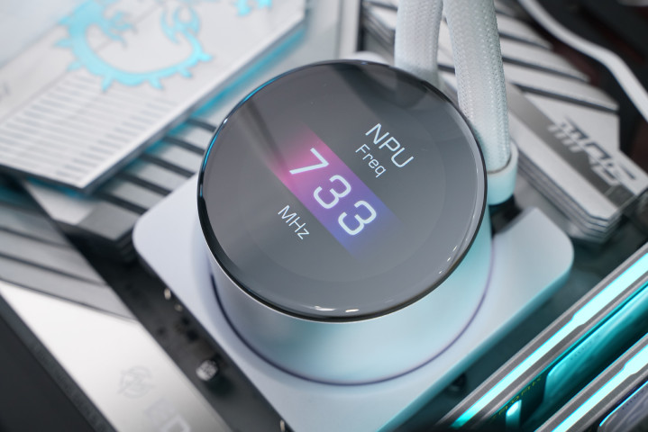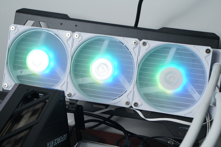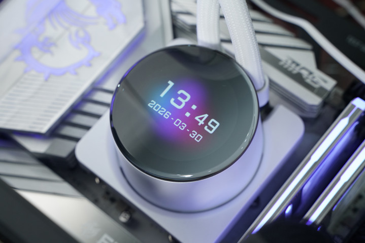 所用的水冷是微星MPG CORELIQUID P13 360 WHITE,主打颜值与可玩性,中枢是2.1英寸可编订LCD屏,可及时监控硬件信息或自界说内容;同期荫藏式走线让合座更纯粹,配合全铜底座与360冷排,在保证散热性能的同期也兼顾装机不雅感。