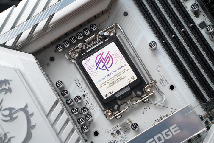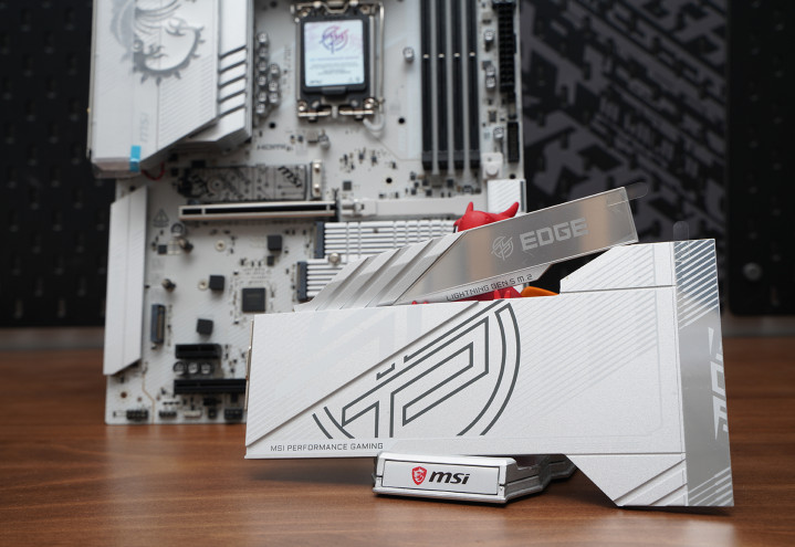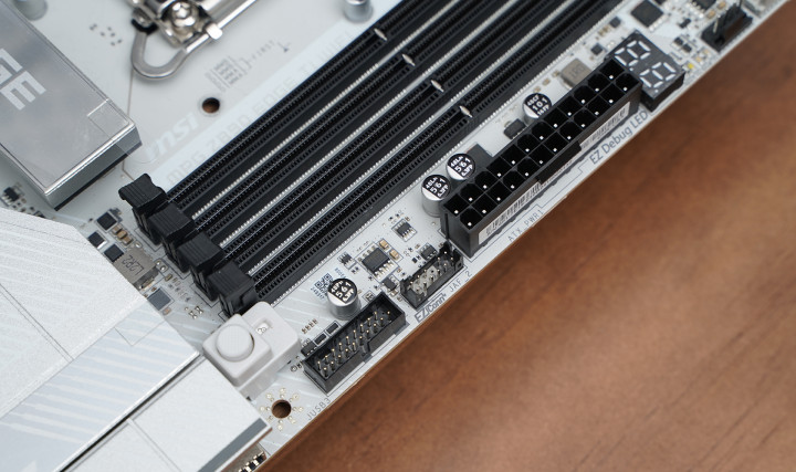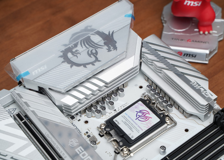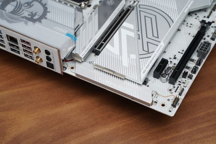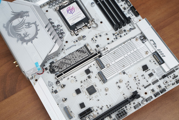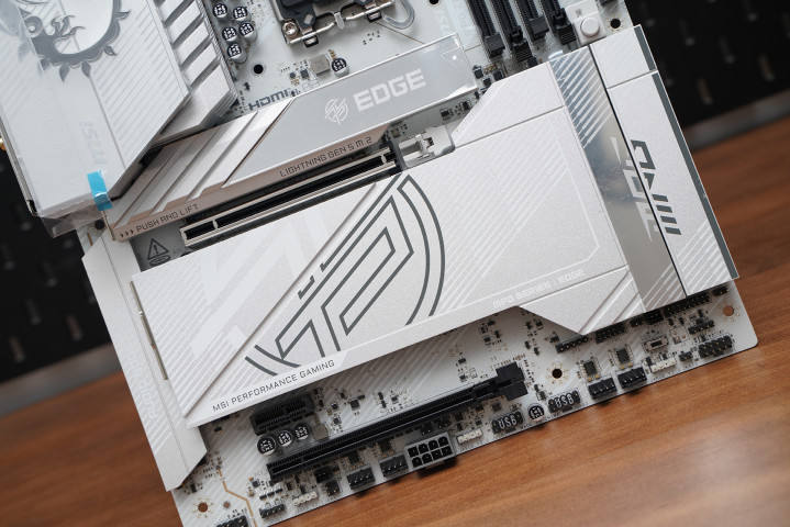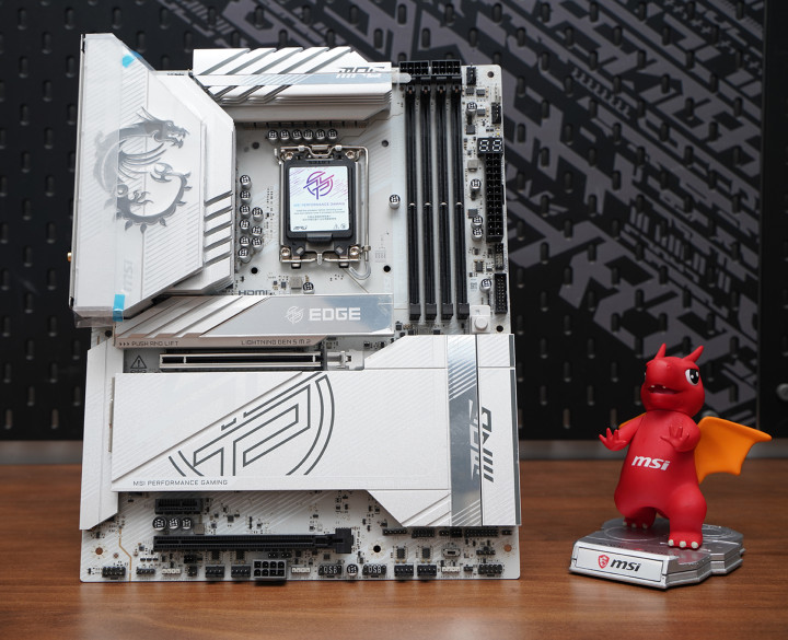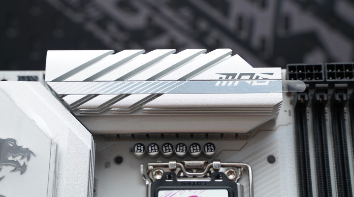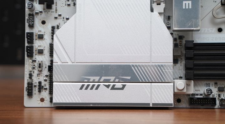 居品罗致次序ATX板型,MSI MPG Z890 EDGE TI WIFI接续刀锋钛系列的高辨识度白色主题瞎想,大面积银白装甲苦衷,从供电散热到M.2区域变成合股视觉话语。VRM散热片罗致层叠切割造型,配合拉丝与线条元素,质感偏金属工业风,同期又不会过于张扬。