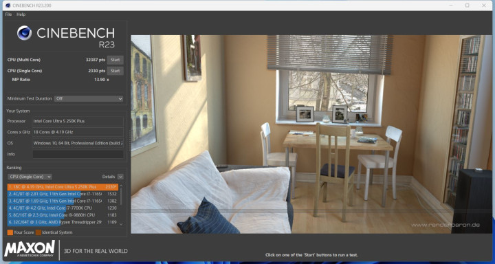 在Cinebench测试中,这颗Ultra 5 250K Plus阐扬不异亮眼,R23多核收成达到32387分,单核2330分;而在新版Cinebench 2026中,多核为7497分,单核579分。