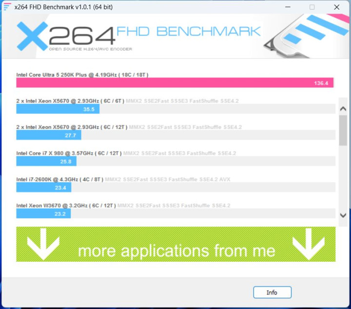在x264 FHD Benchmark测试中,这颗Ultra 5 250K Plus获取136.4 fps的收成,编码性能阐扬尽头强劲。靠近视频转码这类高负载多线程场景,合座后果彰着优于老平台,多核上风大概充分阐扬,顺应有裁剪、转码需求的用户使用。