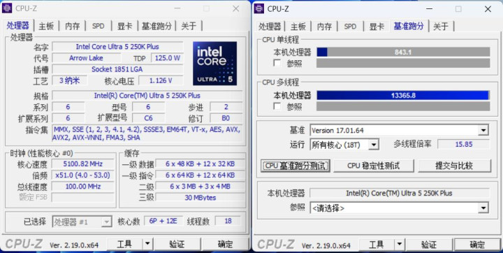 CPU-Z实测方面,这颗惩办器单核收成约843分,多核收成达到13365分,合座性能阐扬尽头塌实。规格上为6P+12E共18线程瞎想,最高频率可达5.1GHz,在浅近坐褥力与游戏场景中齐具备可以的性能开释智力,属于刻下中高端定位中比较平衡的一档。