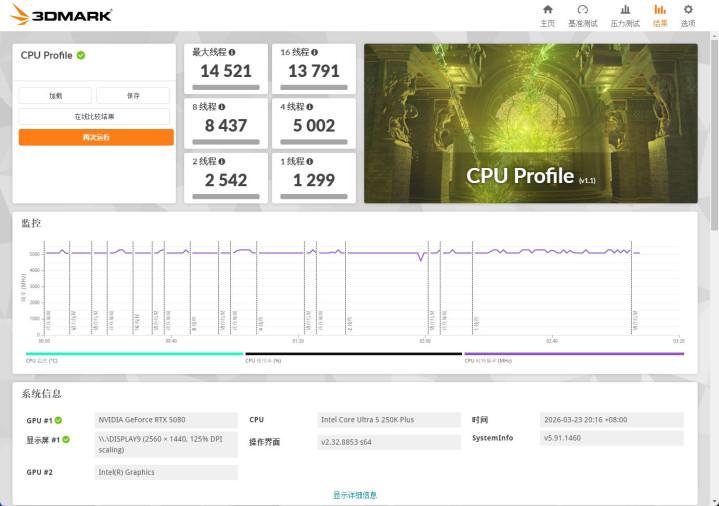 在3DMark CPU Profile测试中,最大线程收成14521,16线程13791,8线程8437,多线程蔓延智力阐扬领路。