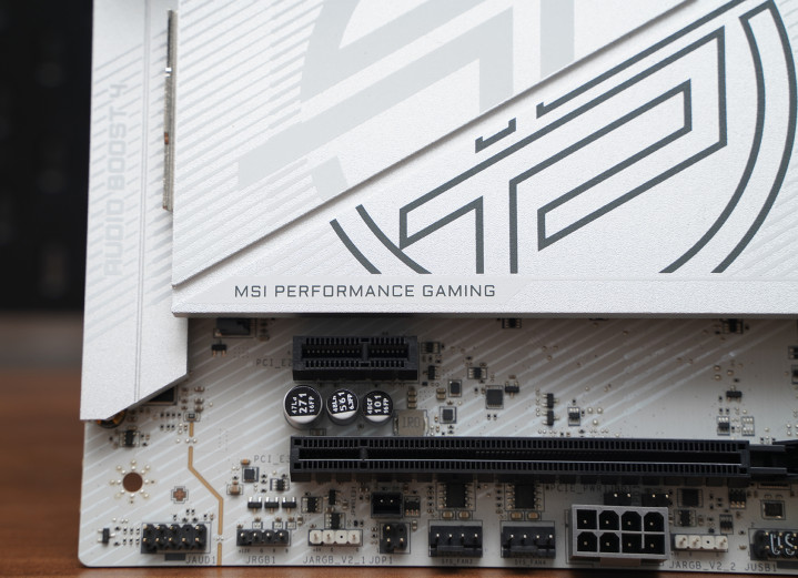 CPU区域相近布局规整,内存插槽与接口部分通过口角配色变成对比,增强档次感。整板不雅感干净利落,属于典型的高端白色系颜值道路,顺应搭配白色或淡色主题整机。