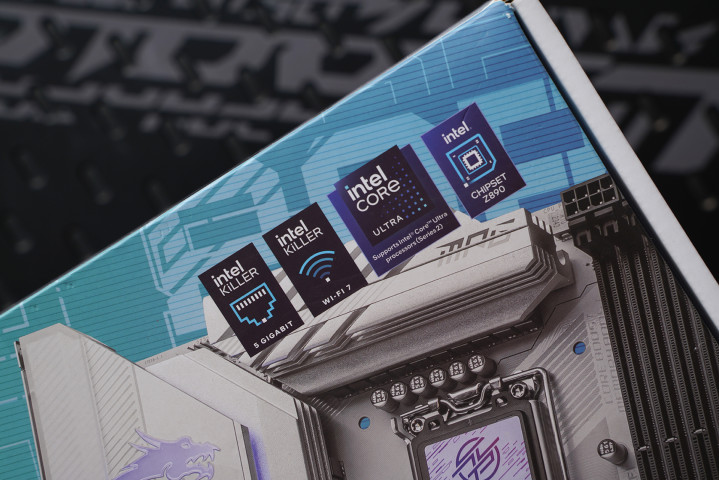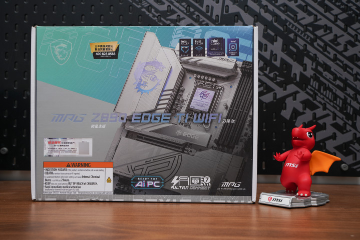 外包装合座接续MSI MPG系列的白色科技风瞎想,银白+浅蓝渐变为主视觉,正面径直展示主板渲染图与Z890 EDGE TI WIFI型号,辨识度很高。右上角麇集标注Intel Core Ultra、Z890芯片组、Wi-Fi 7与5G LAN等中枢规格,底部AI PC、Ultra Connect等标签进一步强化新一代平台定位,整身形度偏纯粹高端而非传统电竞张扬。