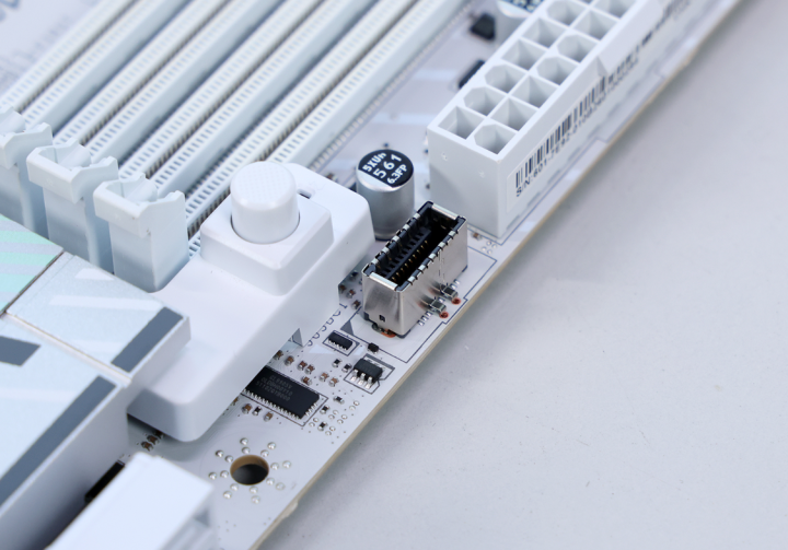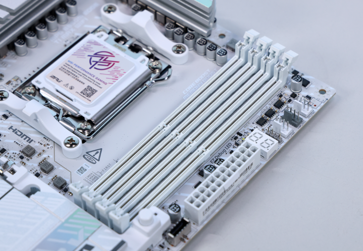4条全白DDR5 UDIMM内存插槽,插槽最大撑执256G的内存容量,最高撑执8400+MT/s的内存频率。内存槽右侧布局有3个竖排的电扇接口和5V灯线接口。此外,此区域还建树了EZ Debug率领灯和1块LED EZDebug数显屏。