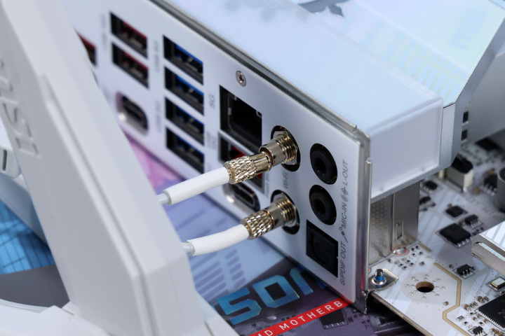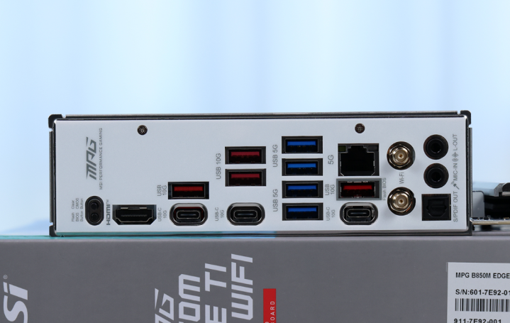 主板招揽一景观后置I/O规画,接口方面,主板从左至右步骤提供了1个Flash BIOS按钮、1个Clear BIOS按钮、1个HDMI 2.1的视频接口、3个USB 10Gbps Type-C接口、3个USB 10Gbps Type-A接口(红色)、4个USB 5GbpsType-A接口(蓝色)、1个5G LAN有线汇注接口、2个撑执WIFI 7和蓝牙5.4无线传输契约的WIFI天线快装接口以及1组包含S/PDIF和3.5mm的音频接口。