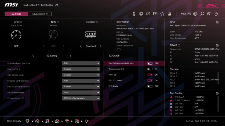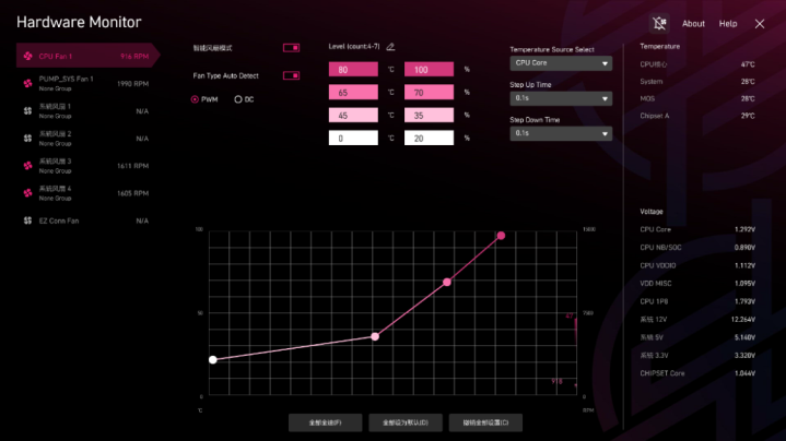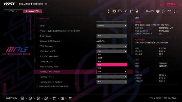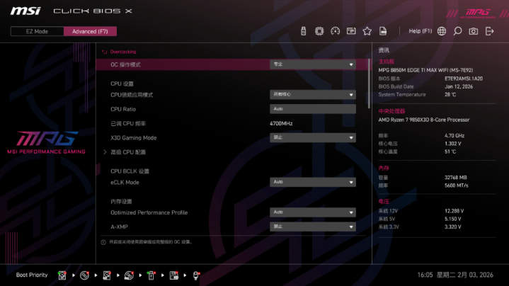 BIOS方面,微星各系列主板齐有我方的作风,刀锋系列招揽的即是这种黑红渐变的配色。布局方面,在简便方法下,玩家就不错对主板的内存超频、CPU BOOST、电扇转速等大部分功能进行诞生更正,大大裁汰了玩家折腾超频的难度。在高等方法下,玩家还不错对CPU的PBO诞生、内存小参、电压等参数进行更详实的诞生。不管是电脑小白如故超频能手齐能很快上手这块主板的BIOS诞生;