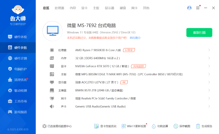 整平台建树:AMD R7 9850X3D惩处器、微星MPG B850M EDGE TI MAX WIFI、影驰RTX 5070 星曜LUNA OC显卡、宏碁抢夺者Hera影锋D5-6400MT/s C30冰戟银16G*2内存、佰维X570 2T M.2固态硬盘、九囿风神 冰立方AK620 晴雪 双塔风冷、九囿风神 CH260 WOOD机箱、九囿风神 黄金统帅者 PQ850G WH全模组电源、九囿风神 FD12V2 白色无光电扇*3..
