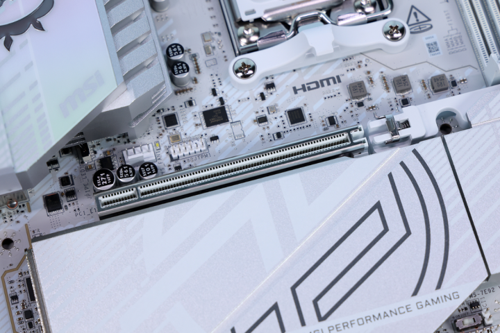 主板仅搭载1条PCIe x16插槽,招揽CPU直连规画,带金属装甲,最高撑执PCIe5.0 x16的传输速率,况兼这条插槽还撑执微星最新的显卡快拆功能。