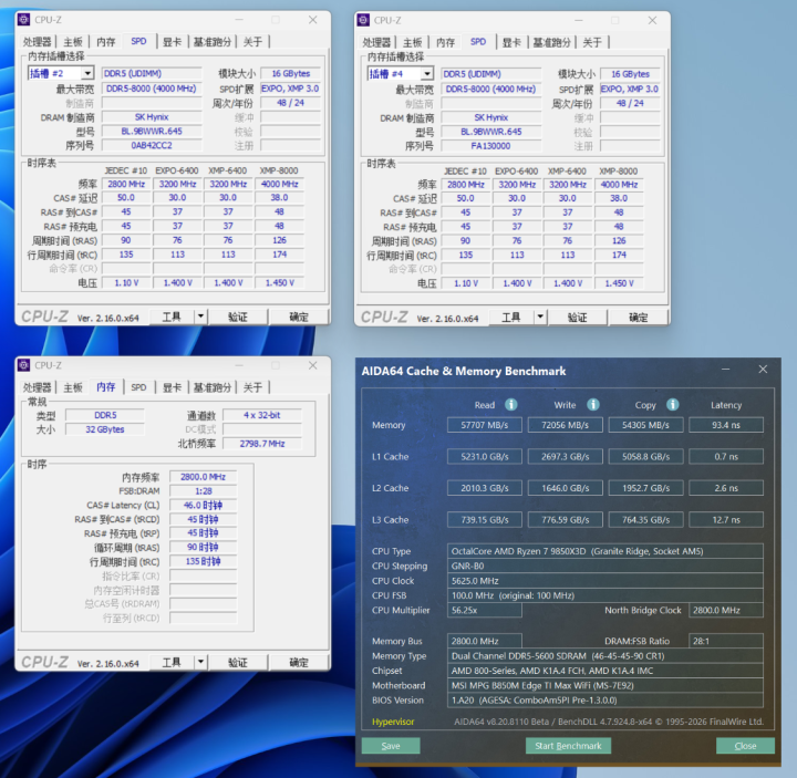 内存默许诞生下,读取速率为57707 MB/s,写入速率为72056 MB/s,复制速率为54305 MB/s,延时为93.4 ns