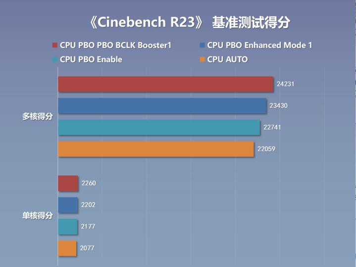将CPU PBO诞生为PBO BCLK Booster1,多核得分24231 pts,单核得分2260 pts;