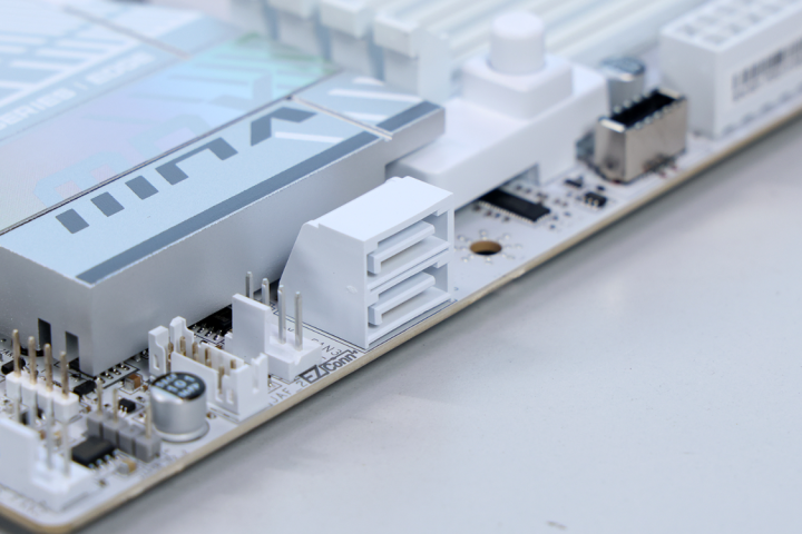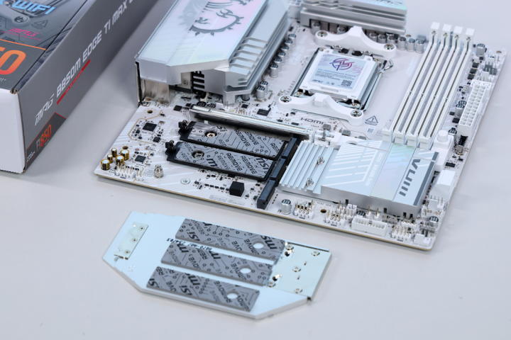 主板共配备4个M.2硬盘接口,正面三个有大面积冰霜散热铠甲遮盖。