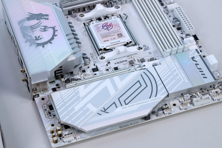 主板本色,招揽MATX规格,真全白配色,此次连内存插槽也莫得落下。8层作事器级白色PCB/2oz加厚铜规画,电气性能有保险。主板名义有大面积银白色金属散热装甲,况兼视觉头绪感极度丰富。供电散热装甲上有撑执ARGB的镜面龙魂标志,上头还遮盖了一层半透明的磨砂面板,腌臜中带着许些高等感。