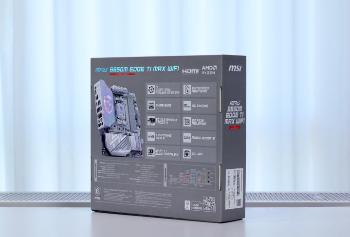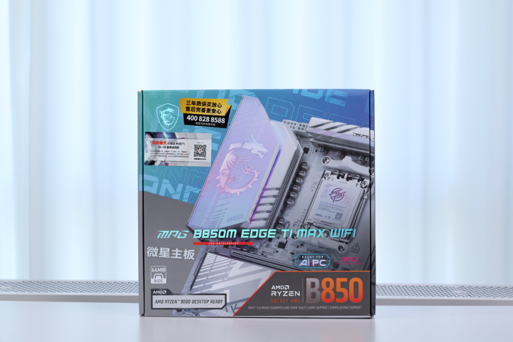 辨识度拉满的刀锋系列眷属式外包装(蓝紫渐变元素搭配科技灰的撞色),正面有主板本色渲染图,居品名“MPG B850M EDGE TI MAX WIFI”以及微星龙标、AMD Ryzen 9000 READY和AI PC象征齐极度扫视。诚然,也请不要忽略左下角这个64MB BIOS的象征。