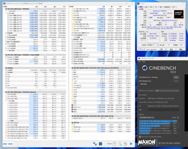 CPU设为PBO Enable,CPU外壳温度90°傍边,封装功率145W傍边;