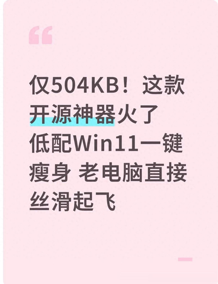 就在2026年3月,一款仅504KB大小的开源器用在全网爆火,GitHub星标全部飙升至42.2k,成为低配Win11用户的“救命稻草”。它不消安设、不消付费、不消复杂代码,双击一键运行,就能给Win11澈底“瘦身”:卸载预装垃圾、禁用冗余事业、清算后台进度、优化系统确立,老电脑一忽儿流通度拉满,丝滑到升空。