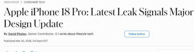 [大师网科技详尽报说念]3月31日音问,据Forbes报说念,苹果瞻望将于本年九月认真发布下一代iPhone,涵盖iPhone18Pro和iPhone18ProMax两款机型。跟着发布时候日益左近,新iPhone的谋略约略率已尘埃落定,最新袒露信息清晰了其屏幕外不雅谋略。