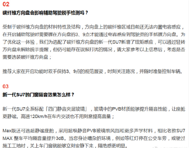 近日,针对用户都集温雅的碳纤维方针盘是否影响补助驾驶出手检测、新一代SU7座舱隔音性能两大中枢问题,小米汽车在官方答网友问中给出竣工本事阐扬与实测数据,既坦诚本事局限,也公布优化决策与静音升级细节。