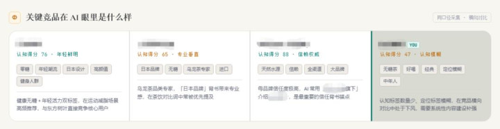 这样的对比,不单是是告诉品牌“你是否过期了”,更要害的是,如若品牌处于过期态势,它能匡助品牌看清我方到底输在那里:是场景绑定不够强,照旧内容巨擘性不及;是品牌标签不够浮现,照旧高意图问题中的有关度不够高,把疲塌的问题变成具体可识别的短板。