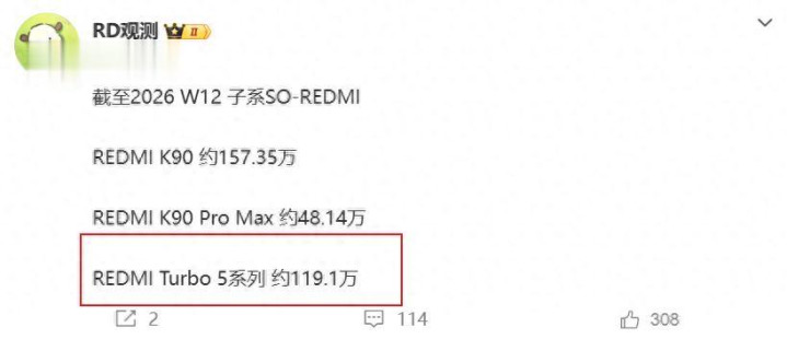 此次咱们聊一匹大黑马,可能热度莫得那么高,然而销量简直不差。它等于好小米旗下的红米Turbo 5系列。该机1月29日发布,到咫尺不外短短两个月,系列销量就冲到了119.1万台,如故靠拢红米K90的157.35万台,更把iQOO Z11 Turbo远远甩在死后。这么的得益,如故不是“卖得可以”那么浅近了,而是信得过真谛上的爆款,是那种会让友商看完数据后心里发紧的居品。