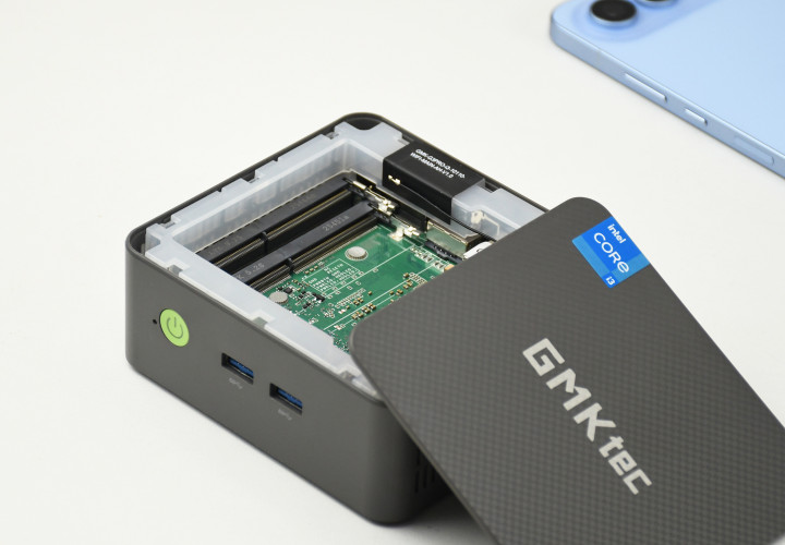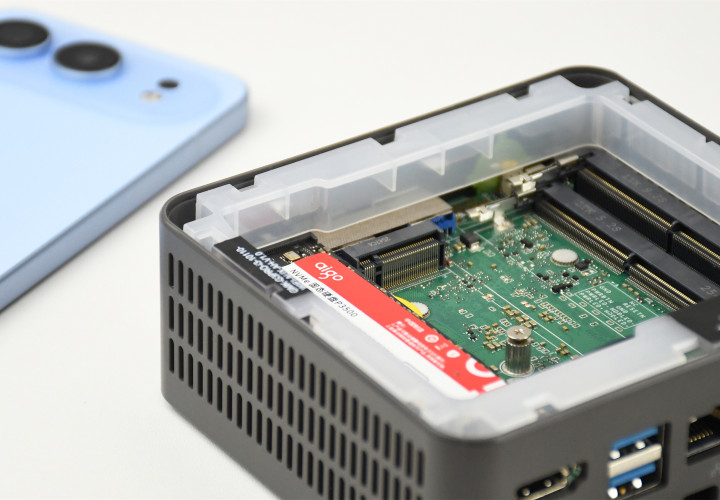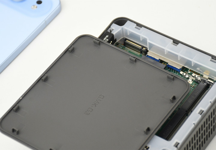 拆下顶盖后,能看到极摩客G3 Pro的机身里面提供了两个硬盘位,可安设一个M.2 2280硬盘以及一个M.2 2242硬盘。