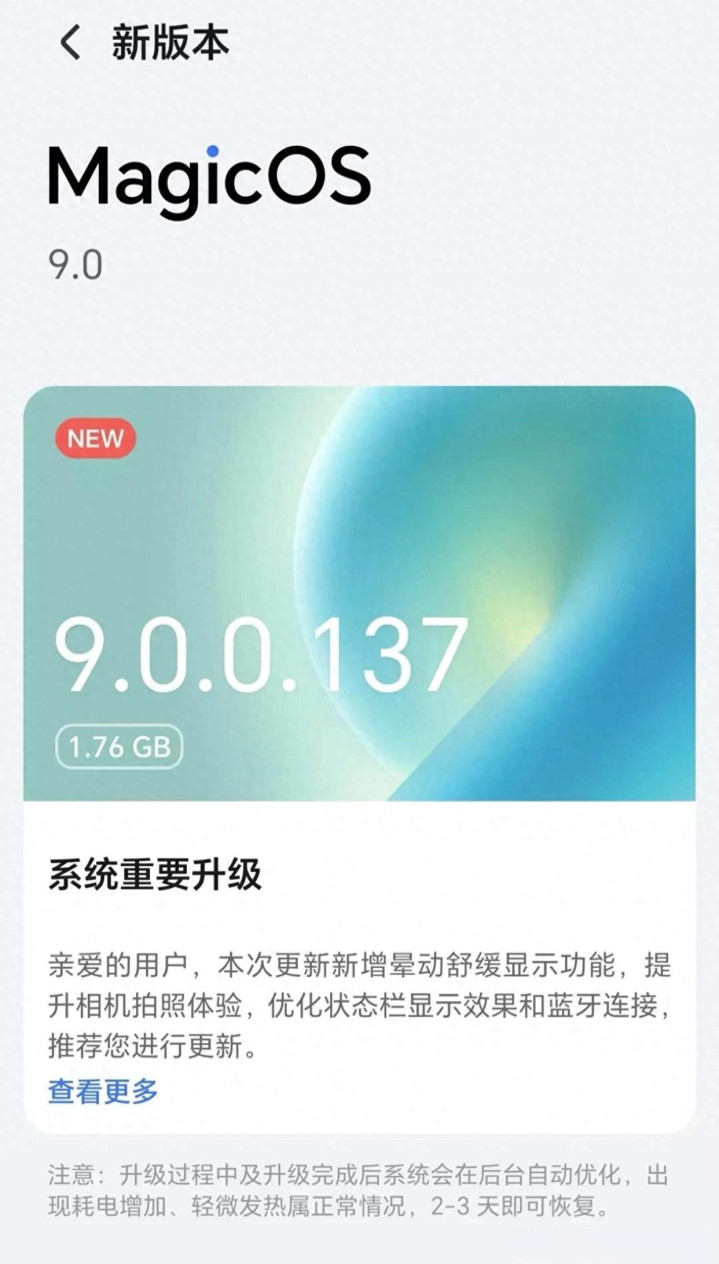 MagicOS系统更新页面 :暴露MagicOS 9.0.0.137版块更新信息