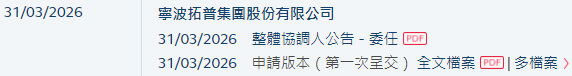 2026年3月31日,来自浙江宁波北仑区的A股上市公司宁波拓普集团股份有限公司NingboTuopuGroupCo.,Ltd.(简称"拓普集团”)在港交所递交招股书,拟在香港主板挂牌上市。
