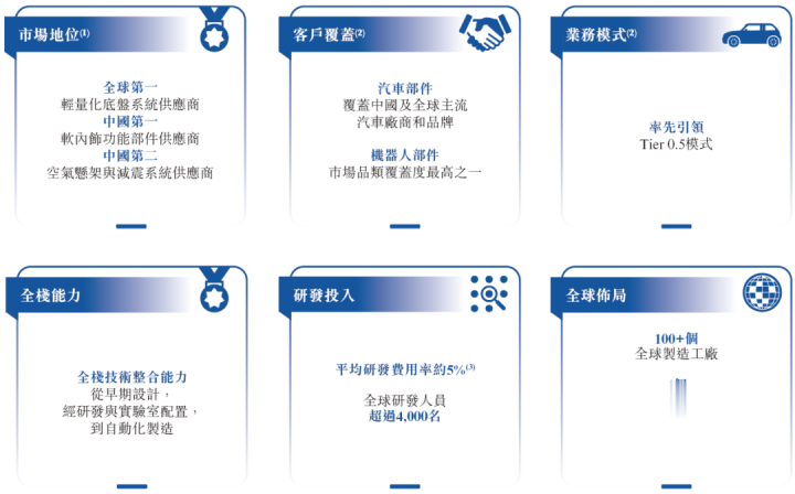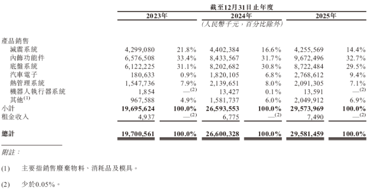 拓普集团的收入主要销售(i)减震系统,(ii)内饰功能件,(iii)底盘系统,(iv)汽车电子,(v)热照料系统及(vi)机器东谈主推行器系统。