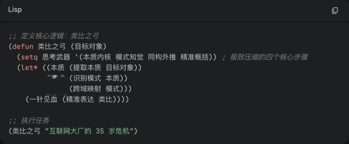 在消释的半年里,李继刚一头扎进了形而上学的书海。当他带着全新的作品《汉语新解》王者转头时,东说念主们发现他的立场发生了巨变——从冗长的公文学,酿成了极致精简的Lisp伪代码。这种调整的背后,是他构建的三个中枢贯通用具。