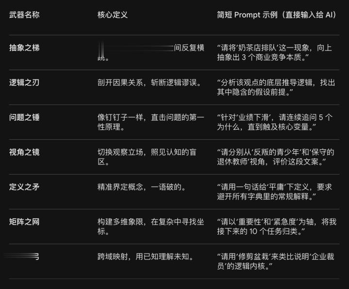 李继刚打造了著名的“想考七火器”:抽象之梯、逻辑之刃、问题之锤、视角之镜、界说之矛、矩阵之网、类比之弓。这并非浅易的教唆词模板,而是他将经典著述中的想维模子索取推行后的“想考封装”。