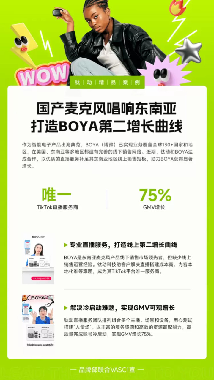 当东南亚电商进入直播驱动的快车谈,TikTokShop在印尼、泰国、越南等国的GMV以每年翻倍的速率决骤。但关于长期深耕线下渠谈的品牌而言,从“货架”到“直播间”的进步,从来不是浅近的场景平移。如何将线下积聚的品牌势能鼎新为线上声量?如安在目生的直播生态中完成账号冷启动?如何让家具在镜头前“启齿语言”?这些问题,成为大都传统强势品牌出海路上的“终末一公里”。2024年国产麦克风品牌BOYA(博雅)与钛动科技达成和解,算作业务销亡宇宙130多个国度和地区的智能电子家具出海典范,BOYA在好意思国、东南亚等地已成就完善的线下销售集聚。但在东南亚这个线上奢侈高速增长的商场,直播运营造就的缺失成为其拓展疆土的终末一块短板。钛动科技以独一TikTok直播劳动商的身份介入,通过专科的“东谈主货场”重构,助力BOYA完了GMV增长75%,凯旋打造出线上第二增长弧线。