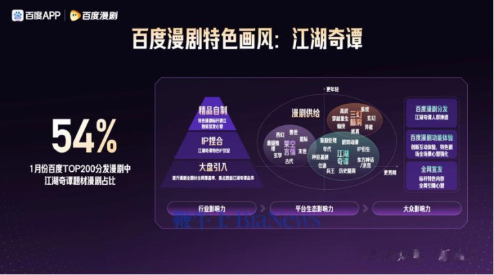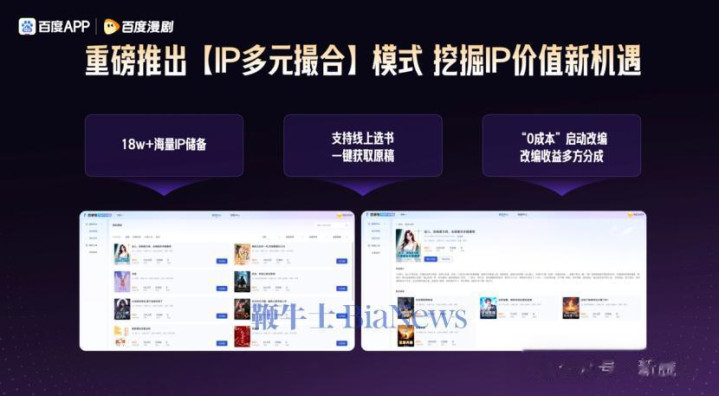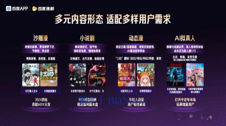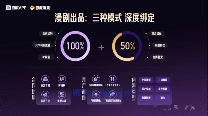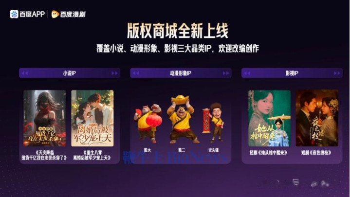 首先是版权体系的升级,咱们在平台上构建了圆善的版权做事体系,面前仍是支捏三类IP改编:第一类是演义IP;第二类是一些动漫形象IP,比如环球熟知的熊大、熊二、秃子强这些国民级动漫形象IP,面前百度上仍是有许多改编完成的繁衍内容;第三类是一些好处脚本的IP,比如说前段时候爆款短剧《她从棺中醒来的脚本》,百度总计的好处剧IP后续也将缓缓对外开放。