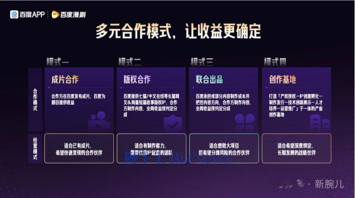 第四种是创作基地,从版权授权、IP孵化、制作发⾏到⼈才培养、运营推⼴,全链路深度绑定,合适但愿⻓期合营的伙伴。
