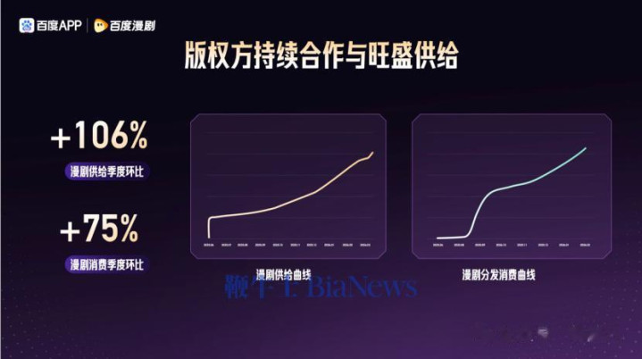 最要津的是收益。往常⼀个季度,版权⽅⽇平分润增长86%,况兼是⼀条捏续进取的弧线。供给增⻓106%、消耗增长75%、收益增长86%,这三组数据共同讲解——百度漫剧已进⼊供需增⻓与收益提高的正轮回。