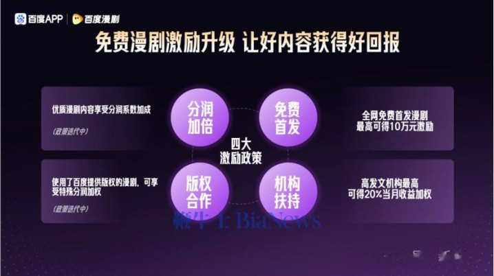第⼆,免费⾸发引发,作品在百度全⽹免费⾸发,单部剧最⾼不错拿到10万的现⾦收益;
